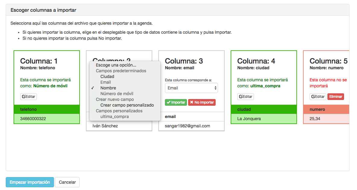 En este paso podemos crear campos personalizados para poder importar datos extra al contacto y guardarlos para su posterior utilización como condicionante en las Campañas Inteligentes o para añadir información personalizada sobre el contacto en tus envíos usando los Campos del contacto en envíos
