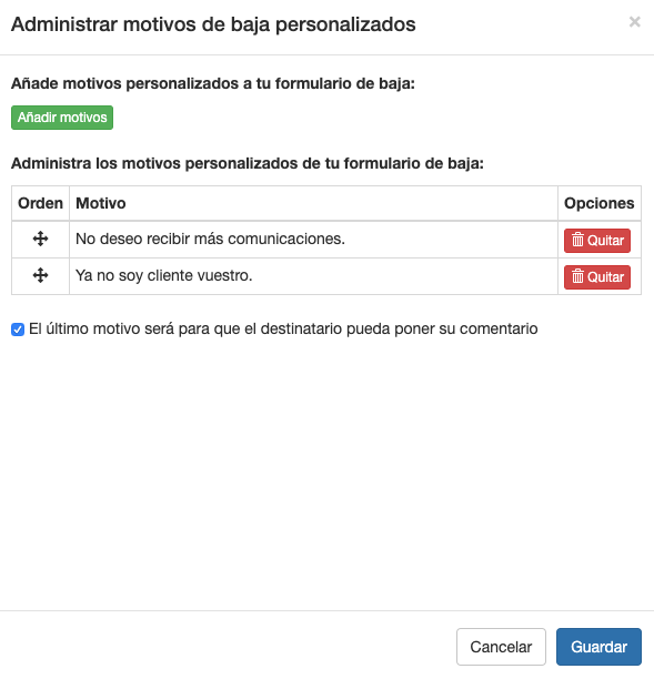 Si quieres añadir como último motivo que el destinatario pueda escribir su propio motivo de baja, activa la opción de 'El último motivo será para que el destinatario pueda poner su comentario'.