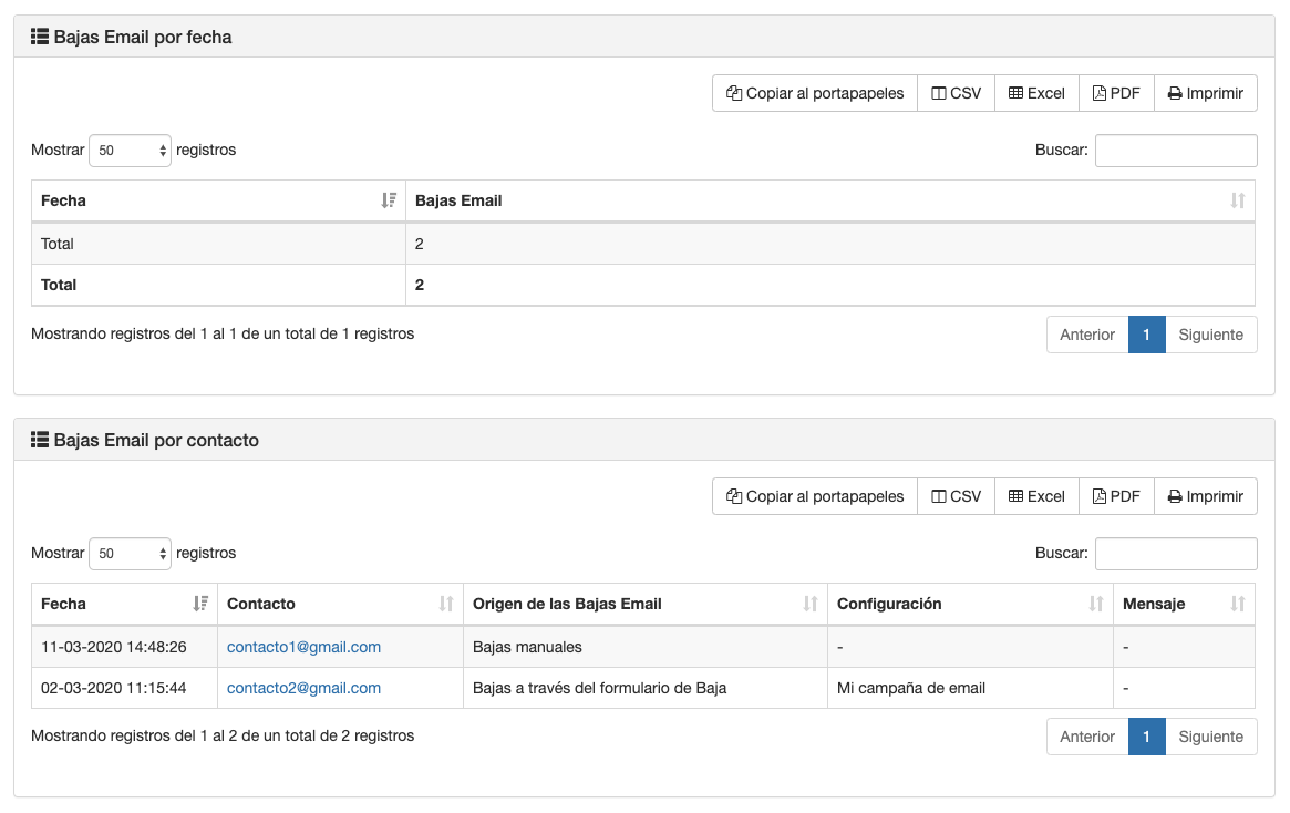 - Un listado con la fecha y el contacto que se dio de baja. Dependiendo del origen de la baja, podrás obtener desde que envío se produjo.