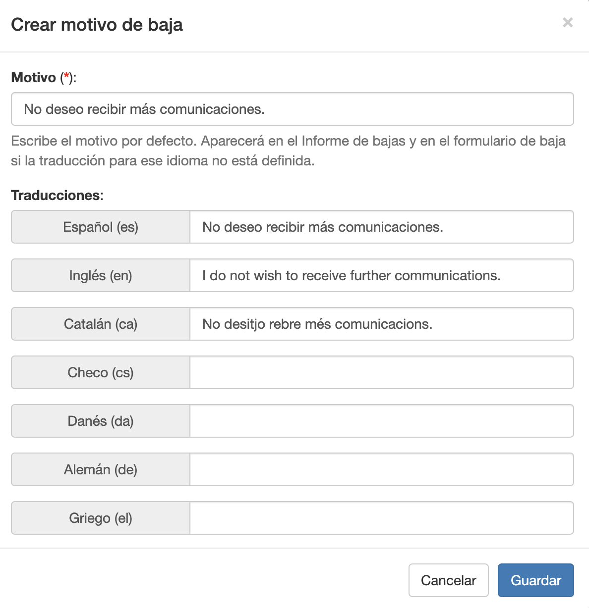 Primero debes crear los motivos de baja en el apartado Preferencias > Bajas > Motivos de baja personalizados. Cuando crees tus motivos de baja, puedes añadir el motivo en cada uno de los lenguajes permitidos por la plataforma. Si no añades la traducción del motivo para un idioma en concreto, cuando se muestre el formulario de baja en ese idioma, se mostrará el motivo por defecto.