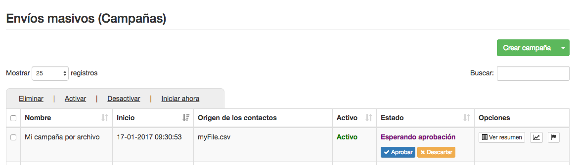 Si escoges 'Sí necesita aprobación', una vez se haya procesado el archivo, la campaña se pondrá en estado 'Esperando confirmación' y deberás aprobar o descartar la campaña. Si la apruebas, la campaña se pondrá en espera hasta la hora de inicio de la campaña. Si la descartas, la campaña será eliminada.