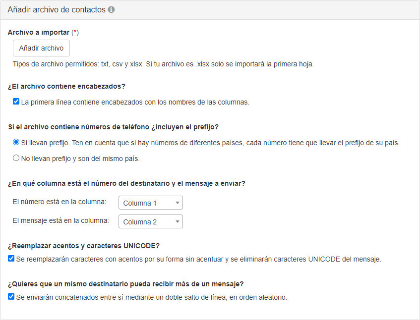- Indica si quieres que reemplacemos del mensaje a enviar a cada destinatario los caracteres con acentos por su forma sin acentuar y eliminemos también todos los caracteres UNICODE dejando sólo caracteres del alfabeto GSM7 para evitar sobrecostes incontrolados en tus envíos. Si deseas que esta opción siempre esté seleccionada, dirígete a Preferencias > Envios SMS > Campañas a través de archivo y selecciona 'Opción seleccionada por defecto'