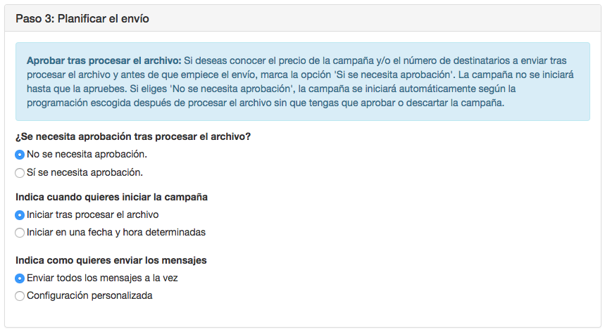 Si escoges 'No necesita confirmación', una vez se haya procesado el archivo se iniciará la campaña según la programación escogida, sin tener que aprobar nada.