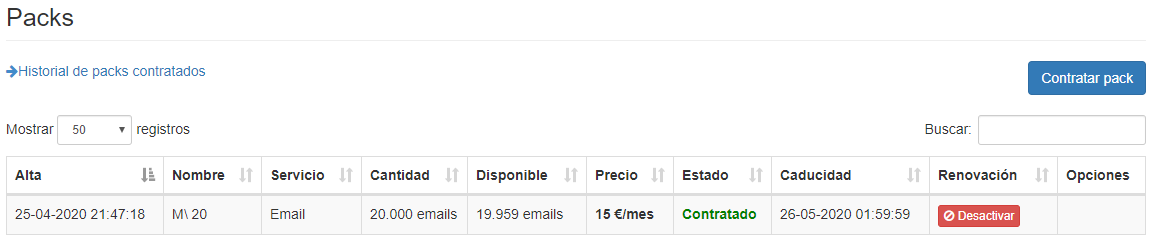 En este listado podrás visualizar todos los packs contratados y que aún permanecen activos en tu cuenta de cliente, mostrando la siguiente información: