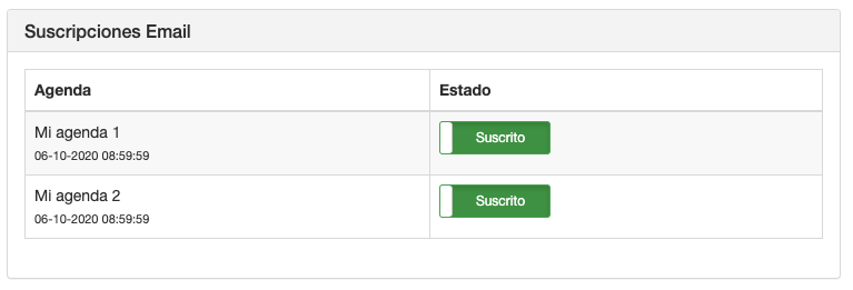 - Por defecto aparecerá un campo de email, el cual es obligatorio para poder guardar el formulario, y las agendas que hayas seleccionado para la suscripción, de esta manera, el usuario podrá seleccionar aquellas agendas a las que se quiere suscribir.