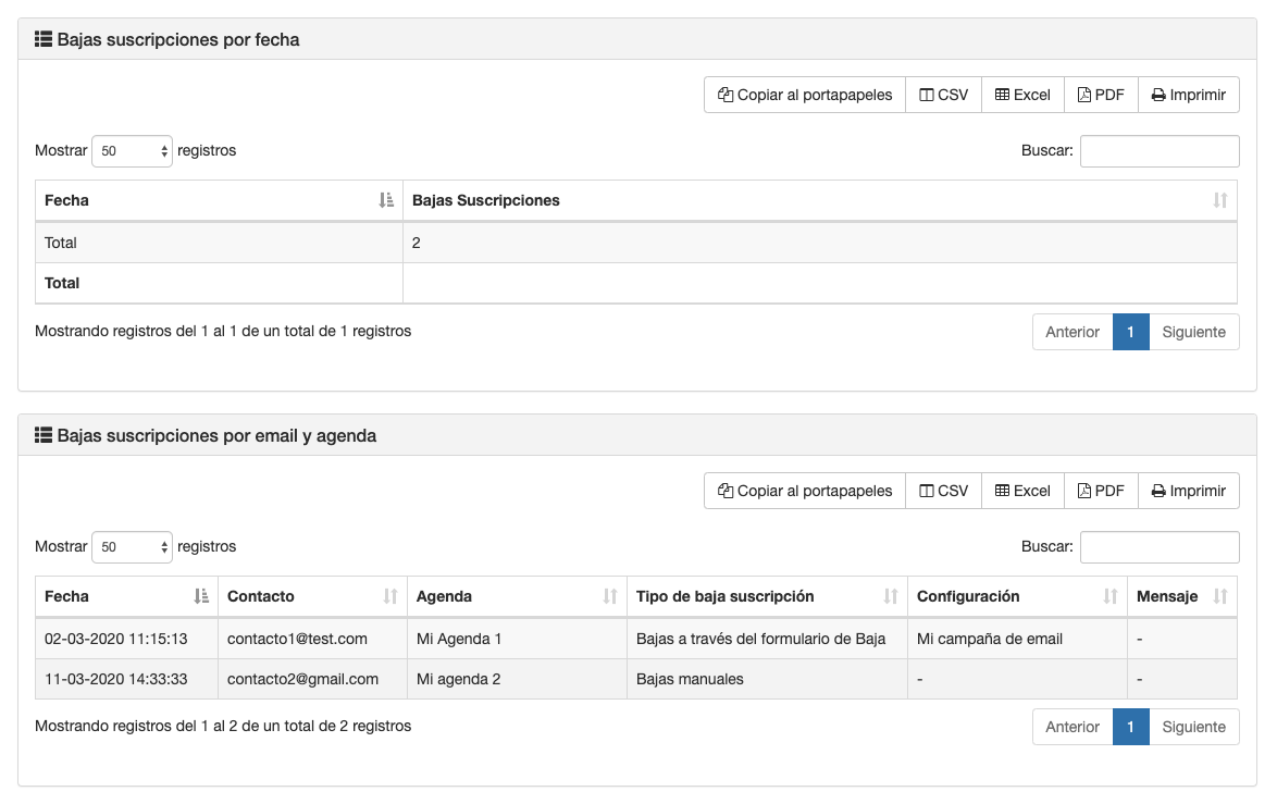 - Un listado con la fecha y el contacto que canceló su suscripción. Dependiendo del origen de la baja, podrás obtener desde que envío se produjo.