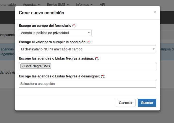 Las bajas a través de Formularios son las bajas que se generán a partir de un Formulario con la opción de Gestionar agendas según respuestas si has configurado una acción que añade contactos a la Lista Negra de SMS.