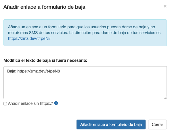 Para facilitar el proceso de inclusión del enlace al formulario de baja, ponemos a tu disposición una herramienta para que puedas añadir cómodamente el enlace a tus envíos. El enlace es acortado para que ocupe el mínimo de caracteres de tu mensaje.