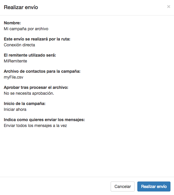 Si escoges 'No necesita confirmación', una vez se haya procesado el archivo se iniciará la campaña según la programación escogida, sin tener que aprobar nada.