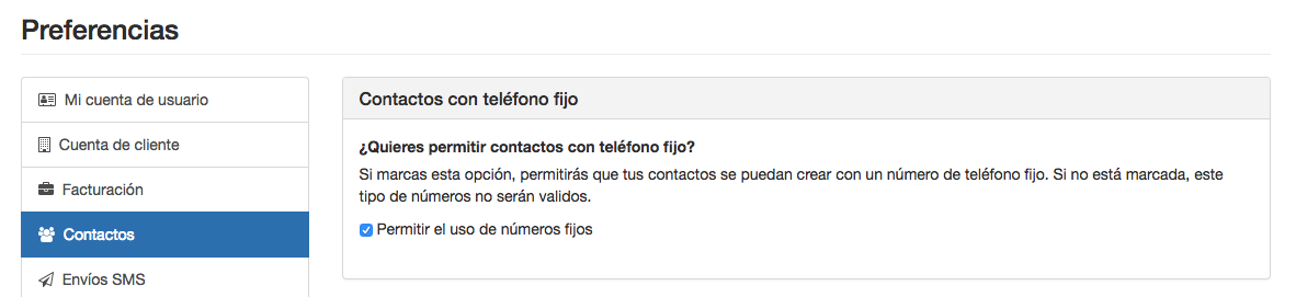 Si quieres habilitar poder tener contactos con número fijo, para poder enviarles SMS y realizar campañas de VOZ, debes activar esta opción en la sección Contactos dentro de las 'Preferencias de tu cuenta'.