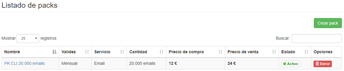 - Opciones: Si en ese momento el pack no lo tiene contratado ningún cliente, o no lo ha usado ningún distribuidor para crear otros packs, podrás pulsar el botón 'Borrar' para eliminar el pack en tu cuenta.
