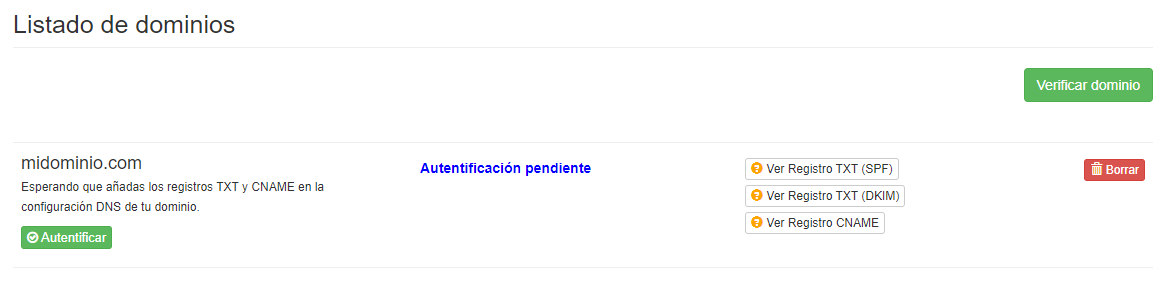 Para autentificar un dominio debes crear los registros TXT (SPF), TXT (DKIM) y CNAME en la configuración DNS de tu domino.
