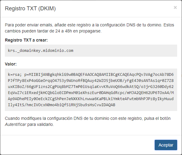 Cuando estés creando este registro en la configuración DNS de tu dominio, debes tener en cuenta que dependiendo de tu proveedor de dominios, puede que sea necesario añadir un punto al final del nombre del registro TXT para el DKIM, aunque algunos proveedores lo añaden automáticamente. En este ejemplo, el nombre del registro TXT seria 'krs._domainkey.midominio.com.'