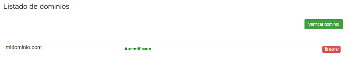 Si después de pulsar el botón, el dominio aun no queda autentificado, lo más probable es que aun no se hayan propagado los cambios de DNS de tu dominio, por lo que deberás ir pulsando en 'autentificar' hasta lograr autentificarlo.
