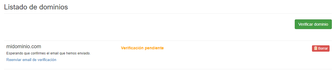 - Cuando lo recibas haz clic en 'verifica el dominio'. Se te redirigirá a la ventana de Dominios dentro de tu cuenta.