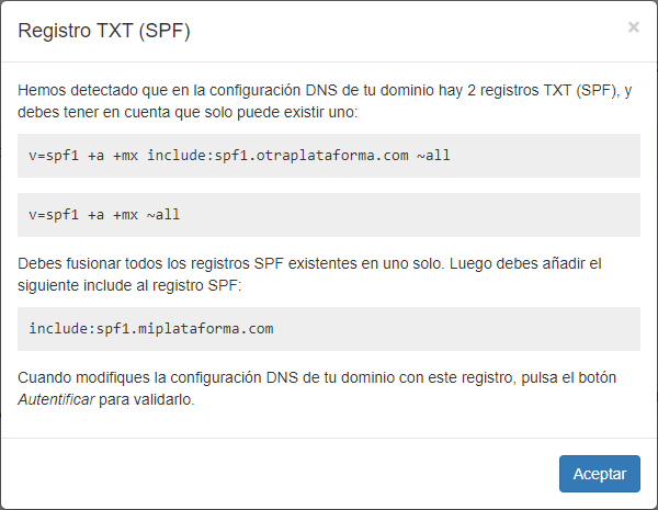 Tu configuración DNS de tu dominio de email no es correcta si tienes más de un registro TXT configurando SPF y esto afectará a la reputación y entregabilidad de tus envíos. Debes fusionar tus registros SPF en uno solo (sólo puede haber uno) y cuando los tengas fusionados, añadirle el valor que te proporcionamos.