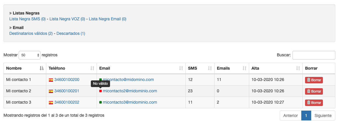 - A través del filtro de destinatarios válidos y descartados del envío de Email.